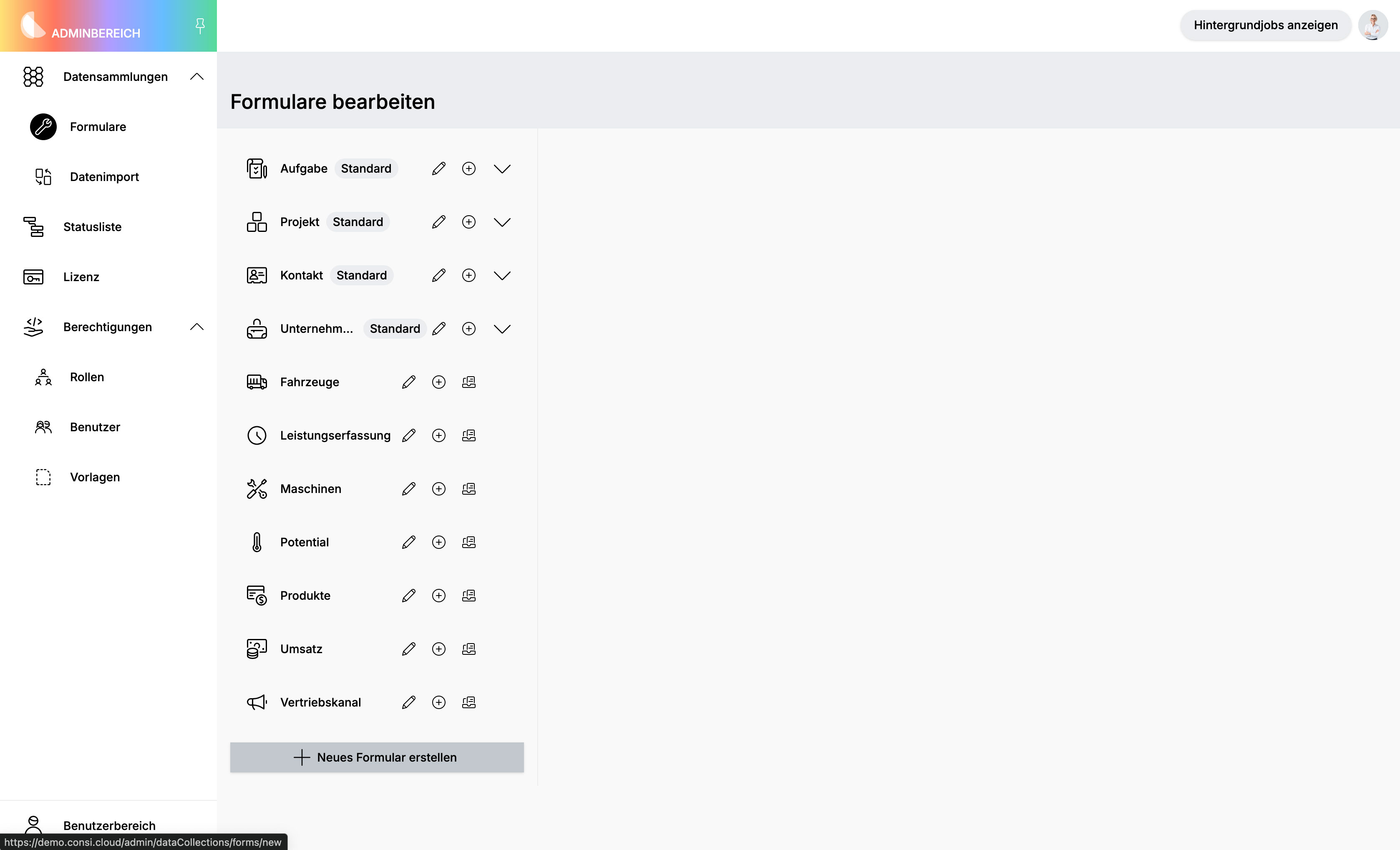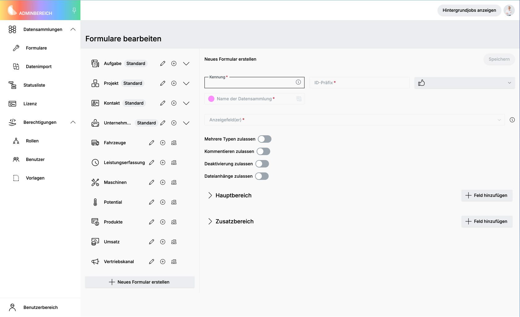 Auf der rechten Seite öffnet sich die Oberfläche zur Erstellung eines neuen Datensammlungsformulars.